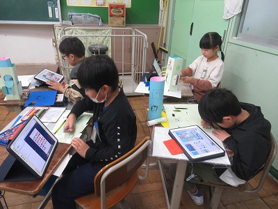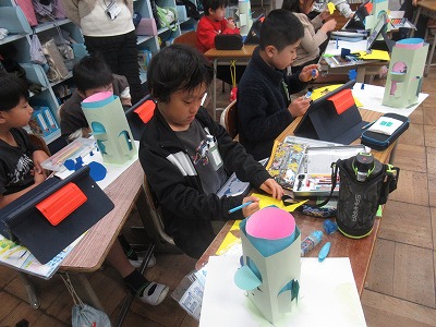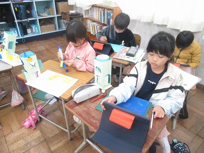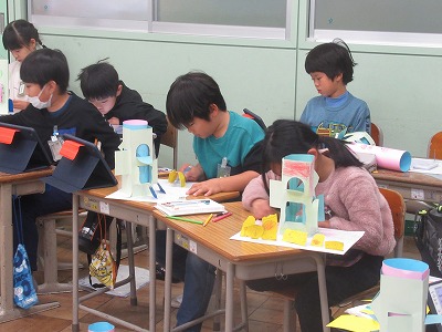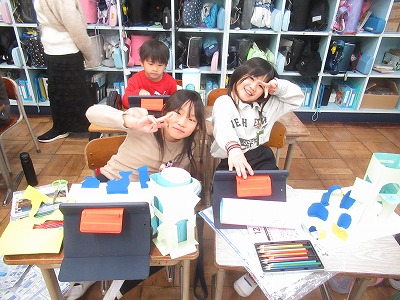 今日は、組み立てた窓のあるタワーから、動物や食べ物、様々な物が見え隠れするように、絵を描いたり、色を塗ったりしました。それぞれ思い思いのイメージがしっかりとあり、楽しそうな作品になりそうです。