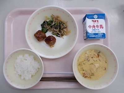 ごはん、つくね、小松菜のおかかあえ、トマトとたまごのふんわりスープ、牛乳
