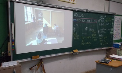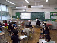 先週の金曜日に出かけた町探検で気付いたことや考えたことを発表しています。担任の先生は、友達の考えを確認しやすいようにプロジェクターで訪問先の画像を示しながら話し合いを進めていました。その後、個人でまとめる場面では、子どもたちのiPadに撮影した画像を転送し、子どもたちはそれを見ながらまとめを進めていました。低学年においても普段の授業でICTの活動が進められていることを感じる一場面でした。