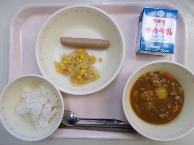 むぎごはん、あまっこカレー、フランクフルト、だいこんサラダ、牛乳