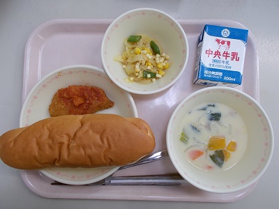 ロールパン、アジフライのトマトソース、スナップエンドウとチーズのサラダ、豆乳スープ、牛乳