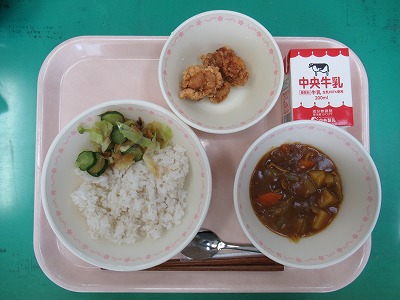 本日の献立:カレーライス(麦ごはん)・牛乳・鶏肉の唐揚げ・福神和え