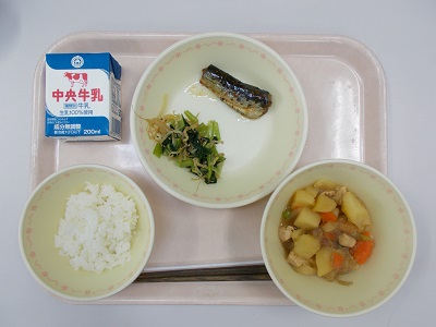 ごはん、とりじゃが、イワシのうめに、ごまあえ、牛乳
