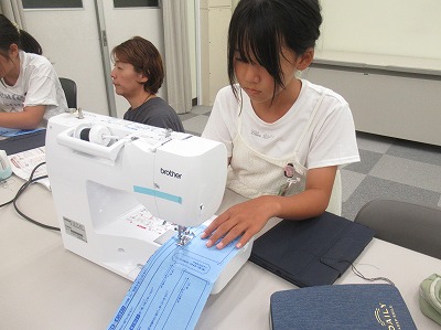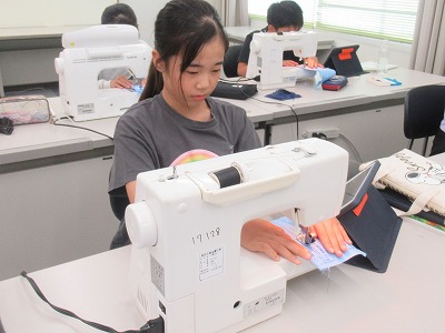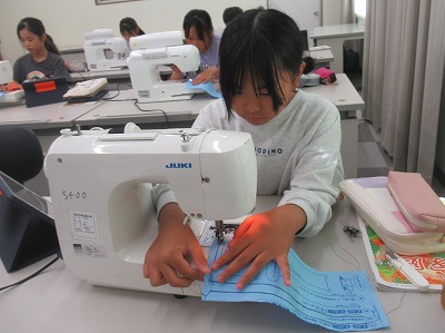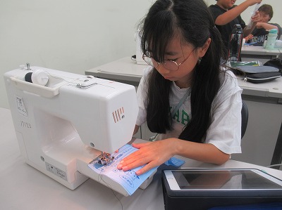 練習布で、まっすぐ縫うこと、途中で曲げて縫うこと、それぞれのやり方をタブレットの動画で確認して取り組むことができました。
