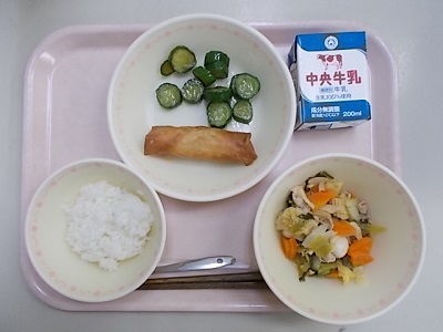 ごはん、八宝菜、春巻き、キュウリの中華漬け、牛乳