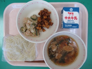 本日の献立:中華麺・牛乳・しょうゆラーメン・ツナサラダ・さつま芋と大豆の黒みつがらめ