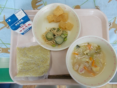 今日の給食の献立は、中華めん・牛乳・豚骨白湯ラーメン・切り干し大根のかみかみ和え・わらび餅です。切り干し大根のかみかみ和えは、歯ごたえや噛み応えがありました。