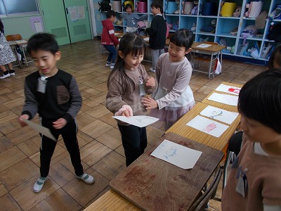 八百屋・果物屋・魚屋のお店には、自分たちで作成した商品を並べて、お店オープン!