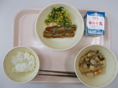 ごはん、ちくわの磯部揚げ、芋煮、菜の花のお浸し、牛乳