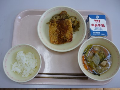 ごはん、牛乳、手作りハムカツ、きんぴらごぼう、麩のお吸い物
