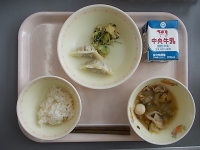 玄米ごはん、愛知の餃子、ナムル、八宝湯、牛乳
