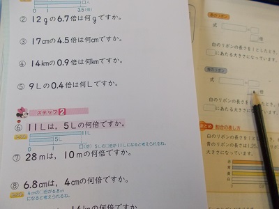問題を読みながら、かけ算で求めるのか、割り算で求めるのか、頭をひねりながら取り組む子どもたちの姿が見られました。
