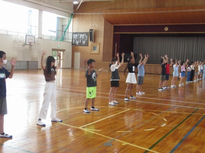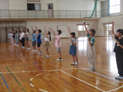 みんなでそろえる練習、ウェーブや体形移動など、教える立場としての自覚をもち、一生懸命に取り組んでいます。見守っている先生たちも「そこ!そろっていいよ!」「左手のひじは曲げて体につけて!」などと声があり、練習にも熱が入っています。