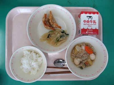 本日の献立:ごはん・牛乳・野菜たっぷり八宝菜・揚げぎょうざ・糸寒天とチンゲンサイのサラダ