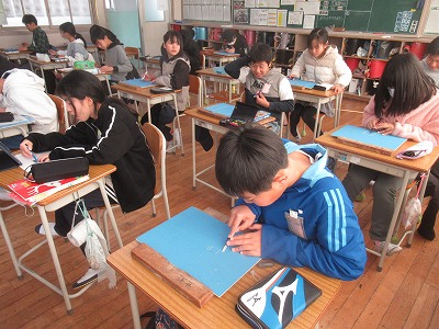 今回は、彫りはじめた段階で、彫刻刀を握りしめ、熱心に取り組む姿が見られました。安全に気を付けてがんばってください!