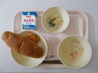 レーズンロールパン、手作り豆腐ナゲット、春菊とツナのサラダ、白菜とベーコンの豆乳スープ、牛乳