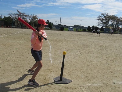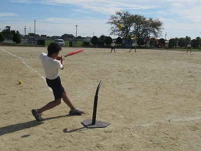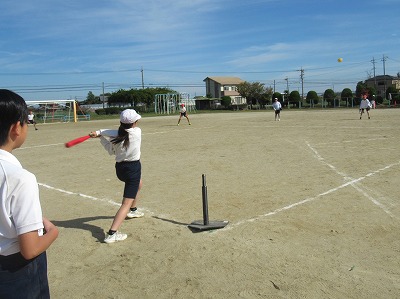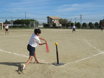 体育では、ベースボール型ゲームを学習しています。6年生は、「ティーボール」といって、投げられたボールではなく、台に置かれたボールをバットで打ちます。