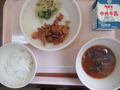 今日は食育献立の日です。愛西市産のれんこんを使った「豚肉とれんこんの甘辛揚げ」、佐屋高校生さんが作った「キャベツの塩レモン和え」、愛西市産の「ミツバ入り味噌汁」など地場産物の食材をたくさん使いました。今日もおいしくいただきました。
