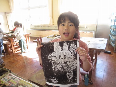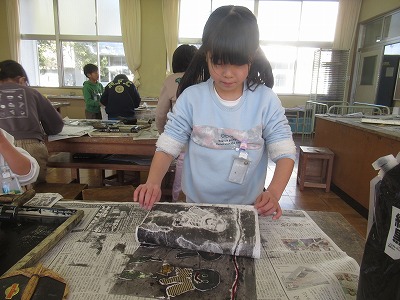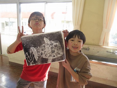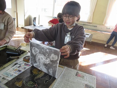 紙は、でこぼこしているので、模様がでてきます。バレンで紙に刷っているときに、その模様が出てきます。そして、紙を丁寧にはがしていくと・・・、きれいに刷り上がって、満足できた様子がたくさん見られました。
