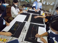 子どもたちの前には真っ黒な画用紙があるだけです。しかし、その黒い部分を竹串で線を引くように削り取っていくとカラフルな模様として浮かび上がってきました。