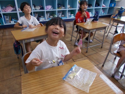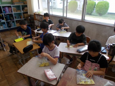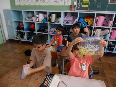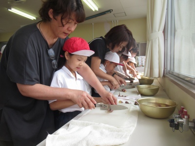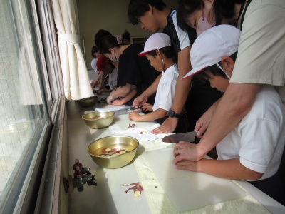 1年生は芋を洗って、2年生は芋を切って、先生たちが芋をふかしました。