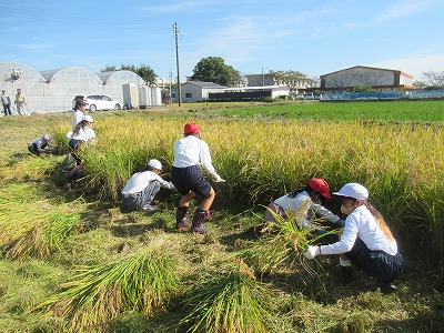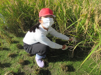 田植えから約5か月経ち、たくさんの稲穂を収穫することができました。5年生の子たちは鎌を手に、最初は一株一株丁寧に、次第にどんどんスピードを上げ積極的に稲を刈っていました。