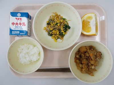 ごはん、揚げじゃがいものそぼろ煮、野菜のおかかあえ、サンフルーツ、牛乳