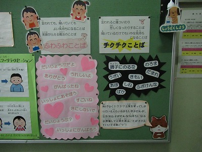 2月の保健室前廊下掲示は、「心の健康」に関する内容です。「ストレスへの対処」、「セルフ・リラクゼーションの仕方」、「ふわふわことばとチクチクことば」などです。