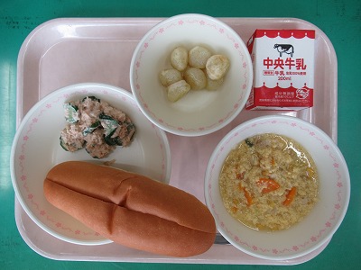 本日の献立:ツナサンドロール・牛乳・じゃがいも餅のガーリック焼き・コーンエッグスープ