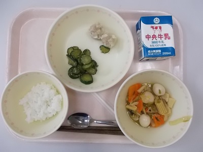 ごはん、八宝菜、シュウマイ、キュウリの中華あえ、牛乳