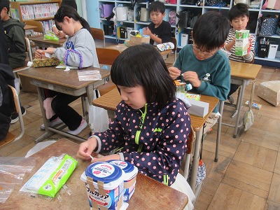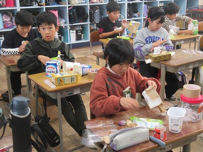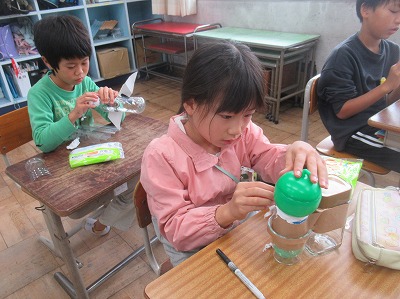 紙箱やプラスチック容器を組み立てて、貯金箱をつくっています。