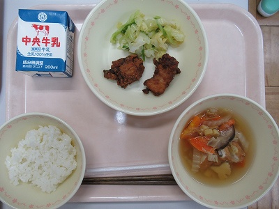 ご飯 牛乳 鶏肉のうまみ揚げ キャベツのあっさり漬け 吹き寄せ汁