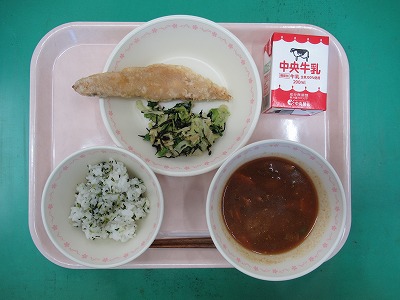 本日の献立:菜めし・牛乳・セレクトフライ(A:トマトソース入りメンチカツ B:たらのコンソメ立田)・ひじきの磯香和え・じゃがいも団子のみそ汁