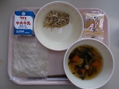 五目きしめん、もやしの青じそサラダ、わらびもち、牛乳