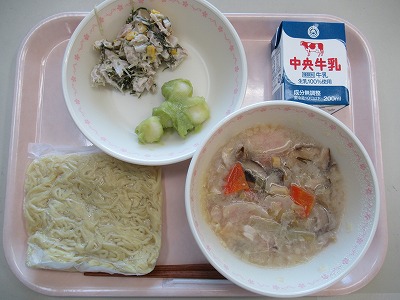 本日の献立:中華めん・牛乳・鹿児島ラーメン・れんこんと水菜の胡麻マヨサラダ・ずんだ餅