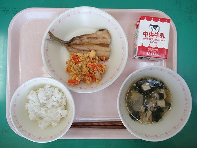 本日の献立:ごはん・牛乳・いわしのかば焼き・にんじんしりしり・具だくさん汁