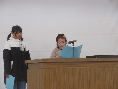 各学年代表者とともに修了証を校長先生より受け取りました。また、1年生と4年生の代表者で、1年を振り返ってスピーチをしてもらいました。がんばったこと、そして次の学年に向けて「かっこいい〇年生へ」という内容で、素晴らしい態度でした。