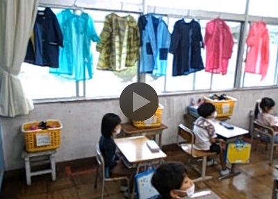 今日は朝から雨のため、教室にはカッパが干してあり、教室に彩を添えてくれています。担任の先生は朝の会で、雨の日の安全な過ごし方についてお話をしていました。