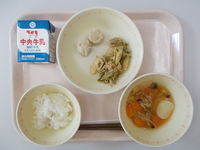今日の給食は子どもたちに人気の中華メニューです。ニンジン、シメジ、大豆もやし、白菜キムチなどたっぷりの野菜をキムチ味のスープでおいしくいただきました。