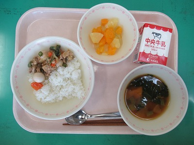 本日の献立:ルーロー飯・牛乳・生揚げのうま味汁・メロンゼリーポンチ