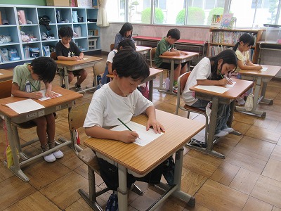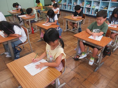 名前を含めた文字をうつくしく書くために、えんぴつの先まで環境を整え、姿勢を正して、集中して書いていきます。シーンとした雰囲気の中、真剣な表情で取り組みました。