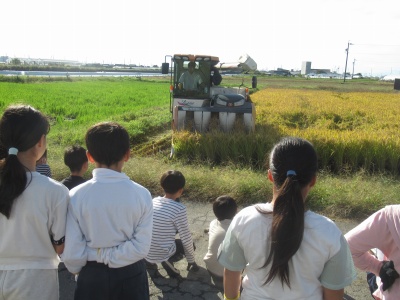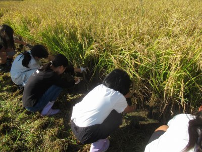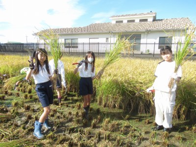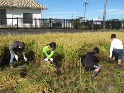 5年生は、6月に田植えをした田で、稲刈りを行いました。