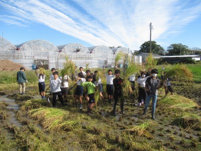 小さな苗が、立派に育ち、稲穂は頭を下げて収穫時期です。稲の持ち方、鎌の使い方を教わり、稲穂を刈り取る作業に入りました。昨晩に雨が降り、足元がぬかるんでいましたが、5年生のやる気パワーで、あっという間にすべて刈り取りました。