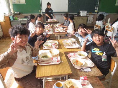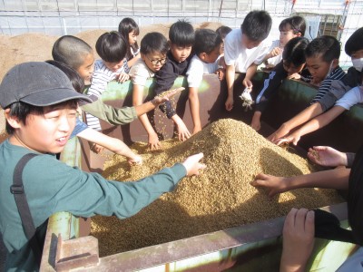 収穫の日は、立田広域委員会より全校児童へ『おはぎとお茶』をいただきました。(写真は4年生。他学年もおいしくいただきました♪)