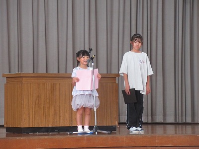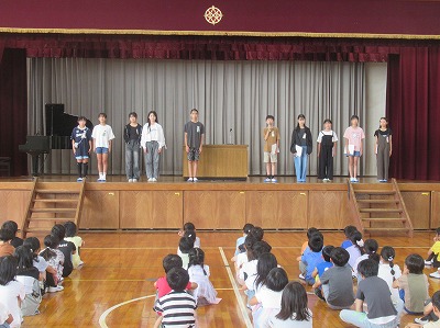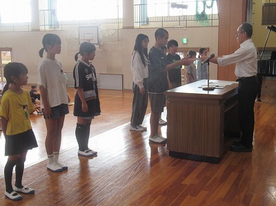 誓いの言葉を代表で2年と5年の児童が堂々とした姿で発表してくれました。その他、児童会役員と学級委員の認証(児童会引き継ぎ式)を行いました。後期の間、みんなをひっぱってよりよい学級・学校にしてくれます。よろしくお願いします。