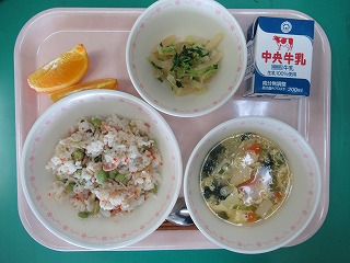 本日の献立:レタスチャーハン・牛乳・豆苗の中華浸し・中華風卵スープ・オレンジ