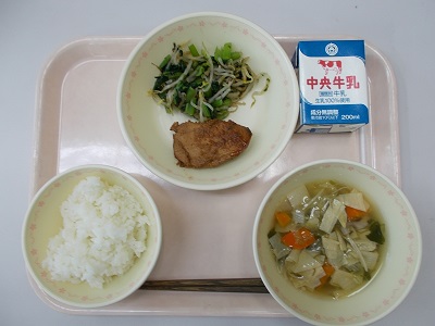 今日は「鉄強化献立の日」です。カツオの血合いの部分には貧血を予防する鉄が豊富とのことです。今の時期にとれる「初がつお」は脂が少なくさっぱりとしています。梅と大葉の香り豊かなみその風味でおいしくいただきました。