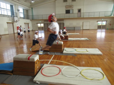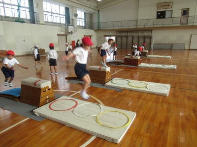 跳び箱から遠くにとぶにはどうしたらいいのかな?自分で発見したことをみんなで共有してチャレンジしています。跳び箱を使うと楽しい!面白い!から学びをスタートさせて、安全を気を配りながら、どんどんチャレンジする精神を応援していきたいと思います。