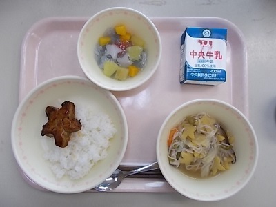 ごはん、お星さまハンバーグ、七夕汁、銀河ゼリー、牛乳