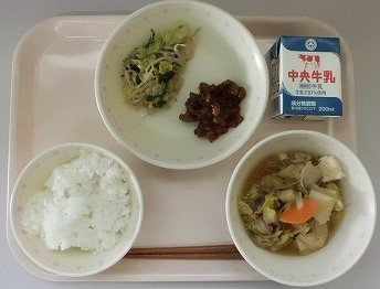 本日の献立:ごはん・牛乳・津島麩入りひきずり・愛西れんこんの鉄火みそ・愛西わけぎの梅がつお和え